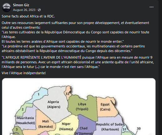“En République Démocratique du Congo (RDC), la surface cultivable est estimée entre 80 et 120 millions d’hectares” (soit entre 0,8 et 1,2 millions de km²)