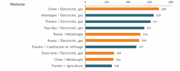 Nous sommes de gros contributeurs à la croissance du PIB chinois. (façon de parler…en tout cas, l’électricité (en partie au charbon) et le gaz chinois sont les plus gros contributeurs à l’empreinte carbone d’un wallon, hors émissions domestiques, d’après le Bureau Fédéral du Plan, image ci-dessous)