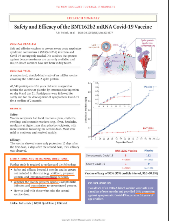 Bien que les connaissances étaient limitées. Par exemple ici, les autorités ont pris leur décision concernant le vaccin Pfizer sur base du résultat de l’essai clinique de phase 3 publié par Pfizer, dans lequel il est écrit “limitations et questions qui restent ouvertes :