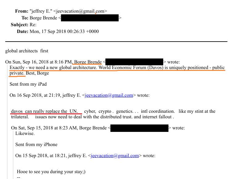 Epstein lui dit : “le WEF peut vraiment remplacer l’ONU (…)”