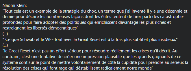 Quand le WEF parle “d’inclusivité digitale”, on pense à “l’apartheid capitaliste” de Hervé Kempf, ou au “techtotalitarisme” de Snowden, ou à la théorie du choc de Naomi Klein.